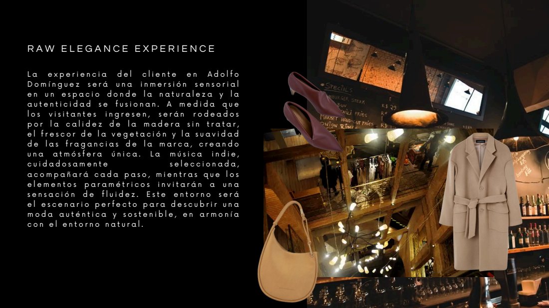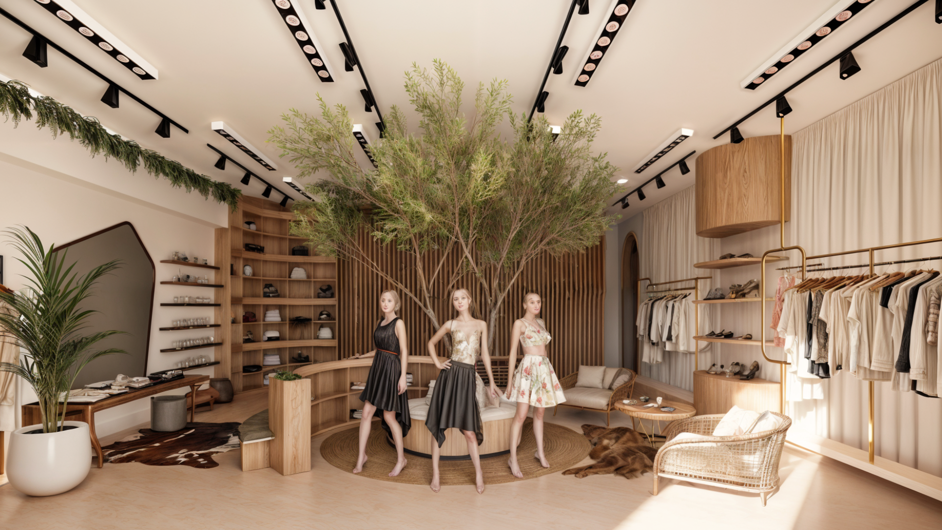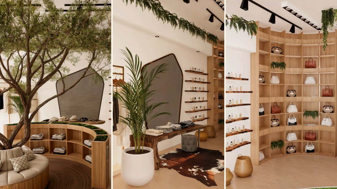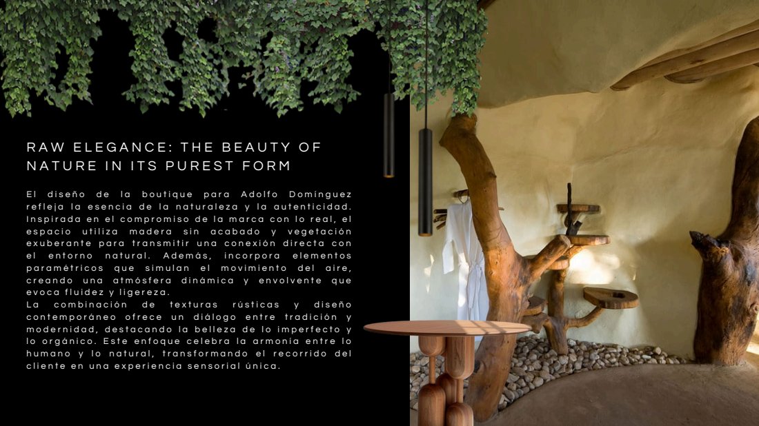 El diseño de la boutique para Adolfo Domínguez refleja la esencia de la naturaleza y la autenticidad. Inspirada en el compromiso de la marca con lo real, el espacio utiliza madera sin acabado y vegetación exuberante para transmitir una conexión directa con el entorno natural. Además, incorpora elementos paramétricos que simulan el movimiento del aire, creando una atmósfera dinámica y envolvente que evoca fluidez y ligereza.