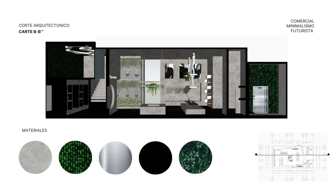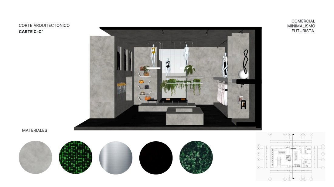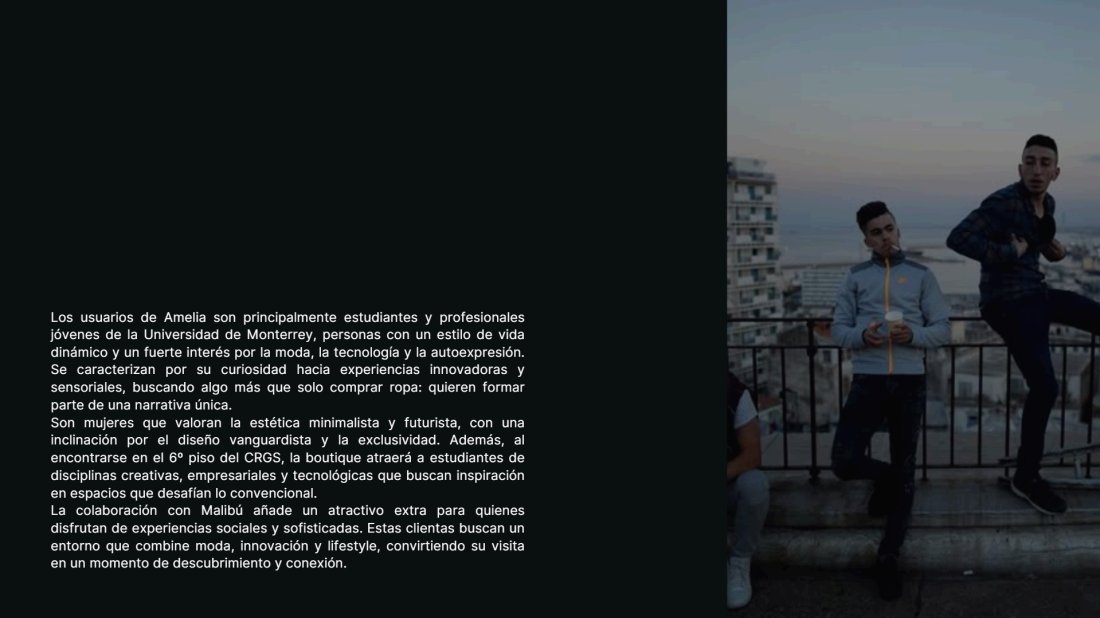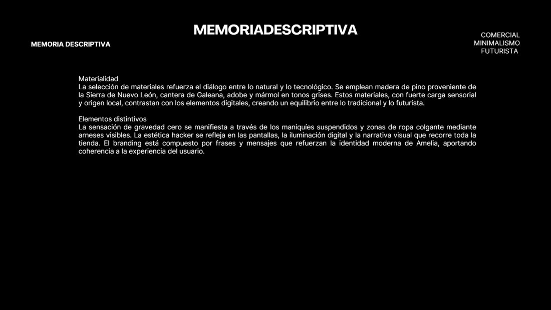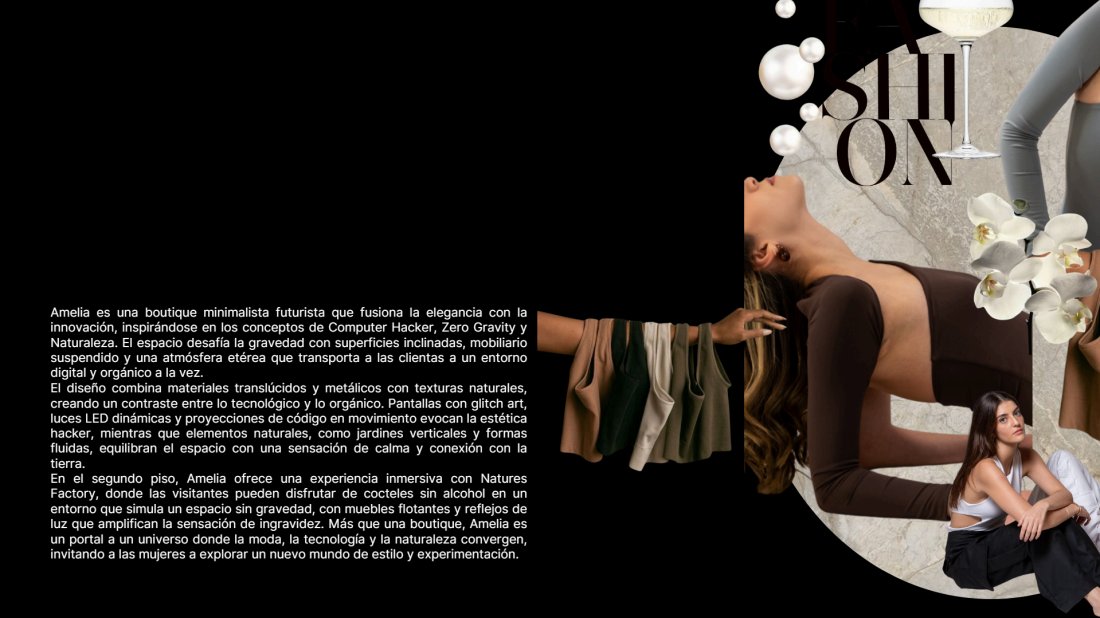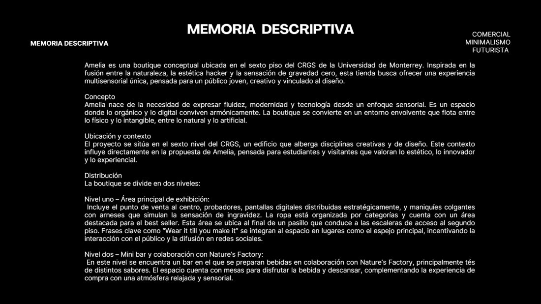 Amelia es una boutique conceptual ubicada en el sexto piso del CRGS en la Universidad de Monterrey. Su diseño fusiona naturaleza, estética hacker y gravedad cero para ofrecer una experiencia multisensorial a un público joven y creativo. Distribuida en dos niveles, integra moda y tecnología en un ambiente envolvente. En el primer nivel, maniquíes suspendidos, frases clave y pantallas digitales crean un recorrido inmersivo. En el segundo, un mini bar en colaboración con Nature’s Factory complementa la experiencia. La materialidad equilibra lo natural y lo artificial, reflejando la identidad fluida, moderna y sensorial de Amelia.
