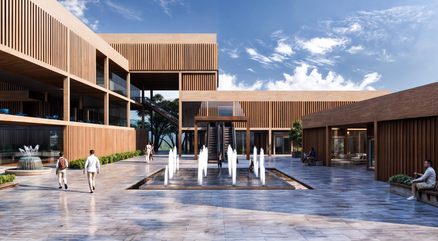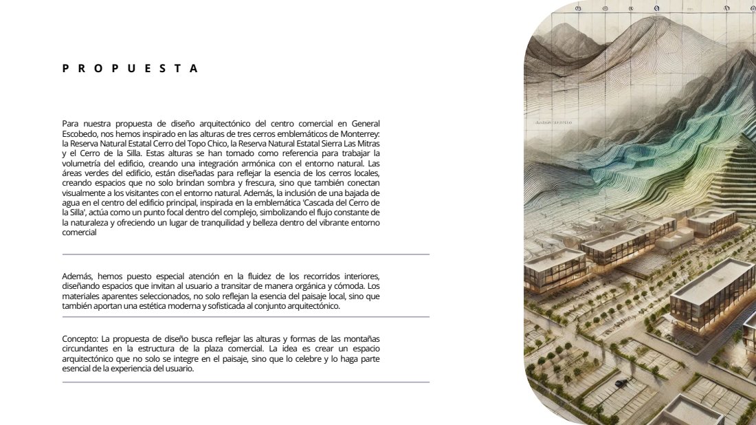 La propuesta de diseño busca reflejar las alturas y formas de las montañas circundantes en la estructura de la plaza comercial. La idea es crear un espacio arquitectónico que no solo se integre en el paisaje, sino que lo celebre y lo haga parte esencial de la experiencia del usuario.
